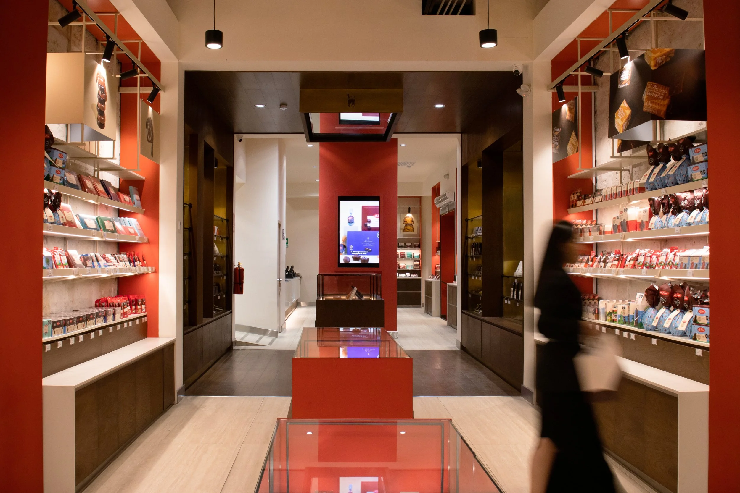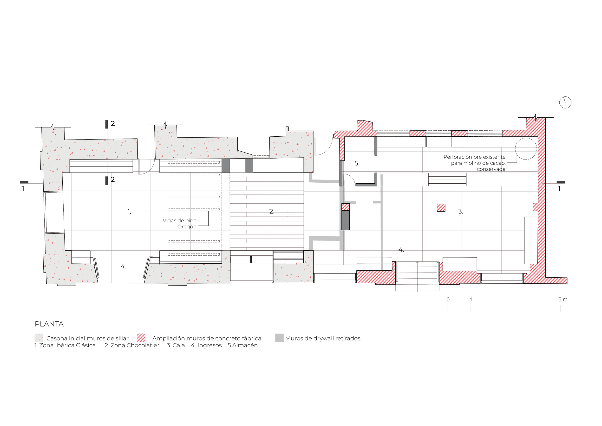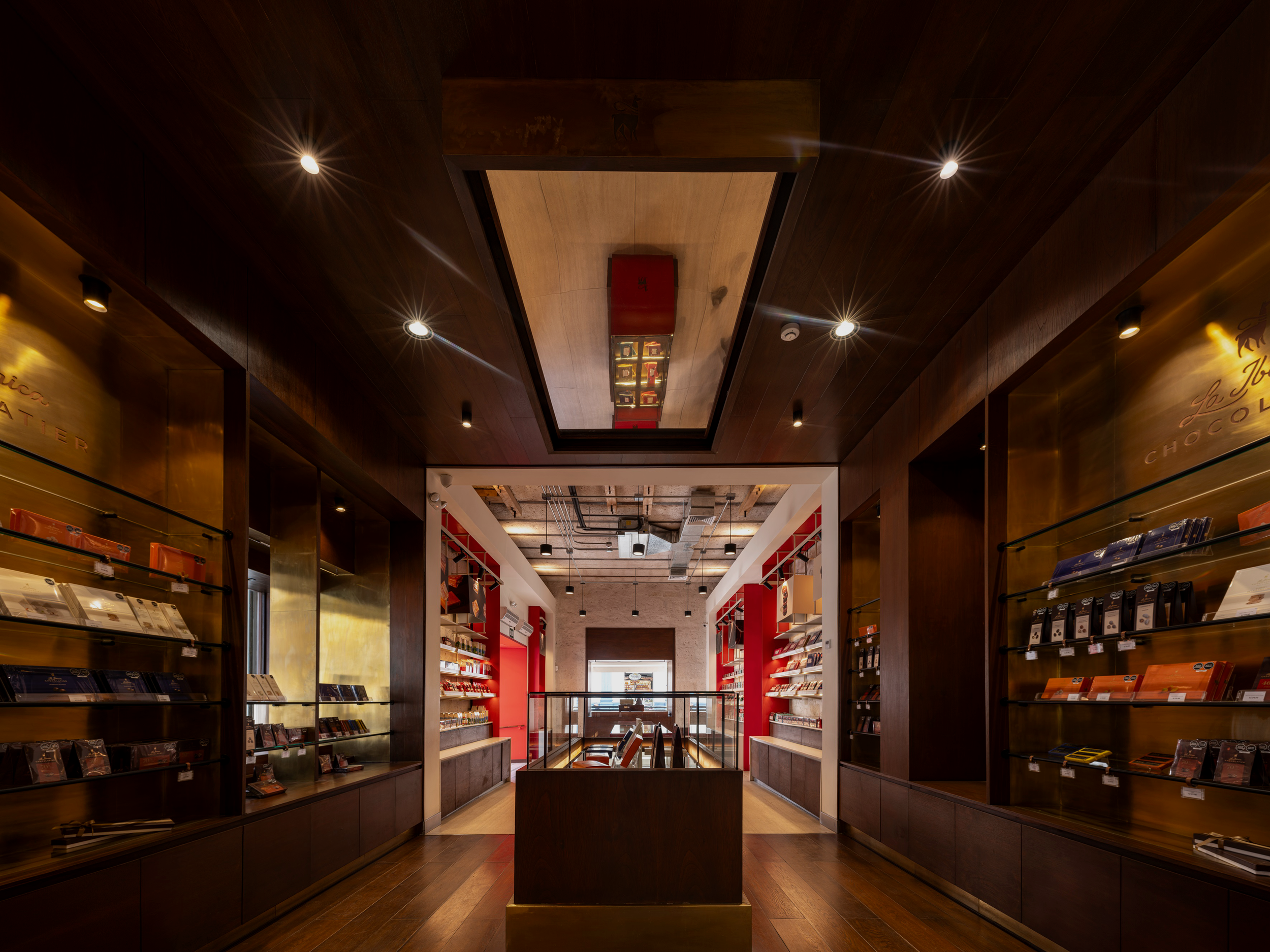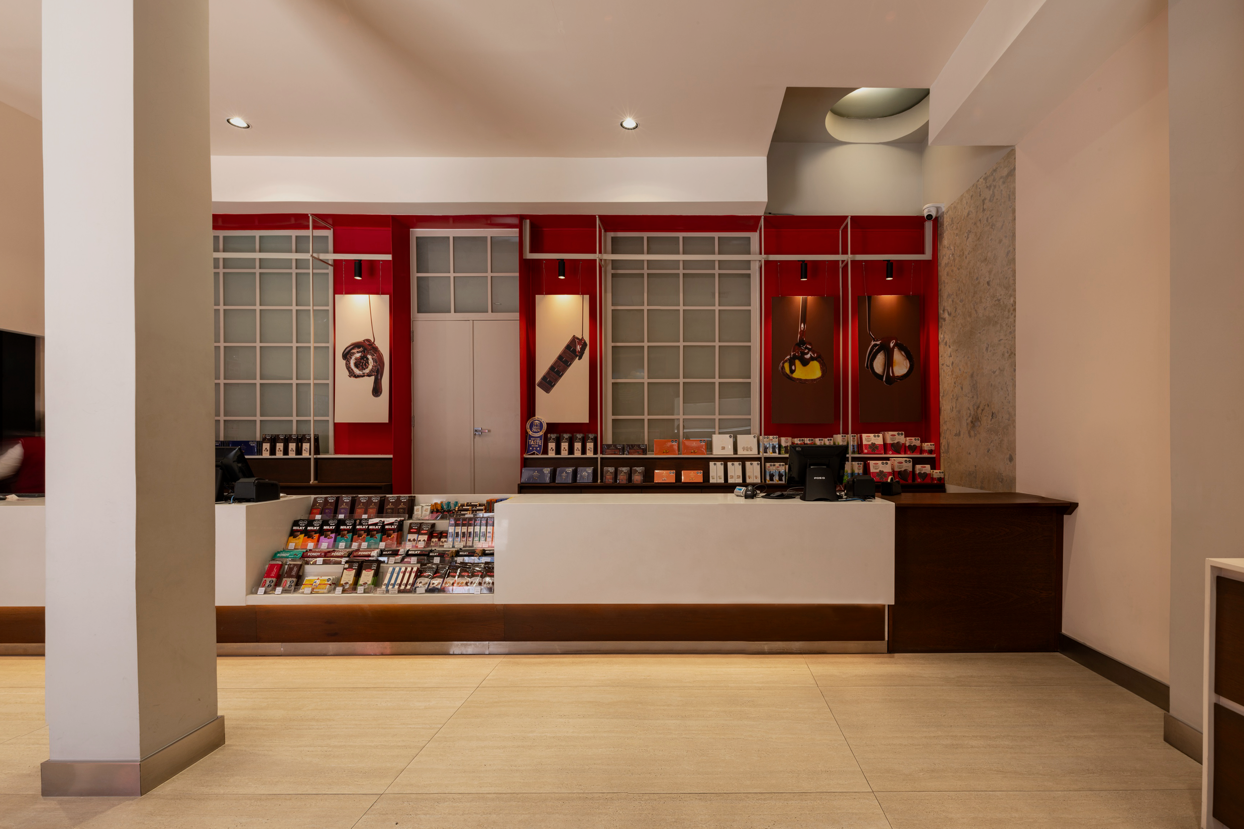Para las áreas correspondientes a la Ibérica Clásica y a la caja, se seleccionaron tonalidades neutras para el revestimiento del suelo y pintura de paredes. Esta selección busca crear un contraste sutil con el sillar, realzando su valor estético. El mobiliario incorpora elementos contemporáneos en términos de materialidad y color, utilizando planchas de hierro tono rojo inspirado en el “geranio cardenal”, característico de Arequipa. Esta selección refuerza la conexión con el entorno local. Se optó por eliminar los fondos en el mobiliario para mantener las paredes originales de sillar sean visibles, en un gesto de respeto hacia el material histórico de la casona. Para la línea Premium, ubicada en el área central sin paredes de sillar ni marcas de la antigua fábrica, se propuso una cobertura completa en madera cedro para el techo, pisos y mobiliario, con un formato y acabado uniforme. Este revestimiento envolvente del espacio se complementa con planchas de bronce en los fondos del mobiliario, evocando la imagen de una caja de chocolates y enfatizando el carácter distintivo de esta sección de la tienda.